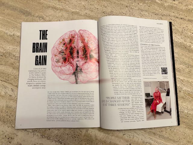 The below article is something I wrote for a recent issue of Harrods Magazine and I wanted to share it here with a little extra commentary because I think it really is a fascinating new frontier in wellbeing and likely you will start reading more and more about it in the press. I have, like many women in their late 30s with a toddler, a full time job and full blown addiction to my phone started to feel the strain on my ability to think sharp and fast. Decreased sleep + increased stress + constant dopamine rollercoaster = decreased cognitive function, that is quite well documented. Perhaps it’s perimenopause, perhaps I am just really really tired but I am partial to loosing my train of thought mid sentence these days. Lots of people thought I was mad to try this treatment - why risk messing with your brain? But the people who knew about TMS, who had read the research, were already on the brain optimisation train or had known someone treated by it successfully, were wildly enthusiastic about it filtering through (albeit in a self-care lite version) to the masses. Let’s dive straight into the feature and I will add a few more notes at the end….